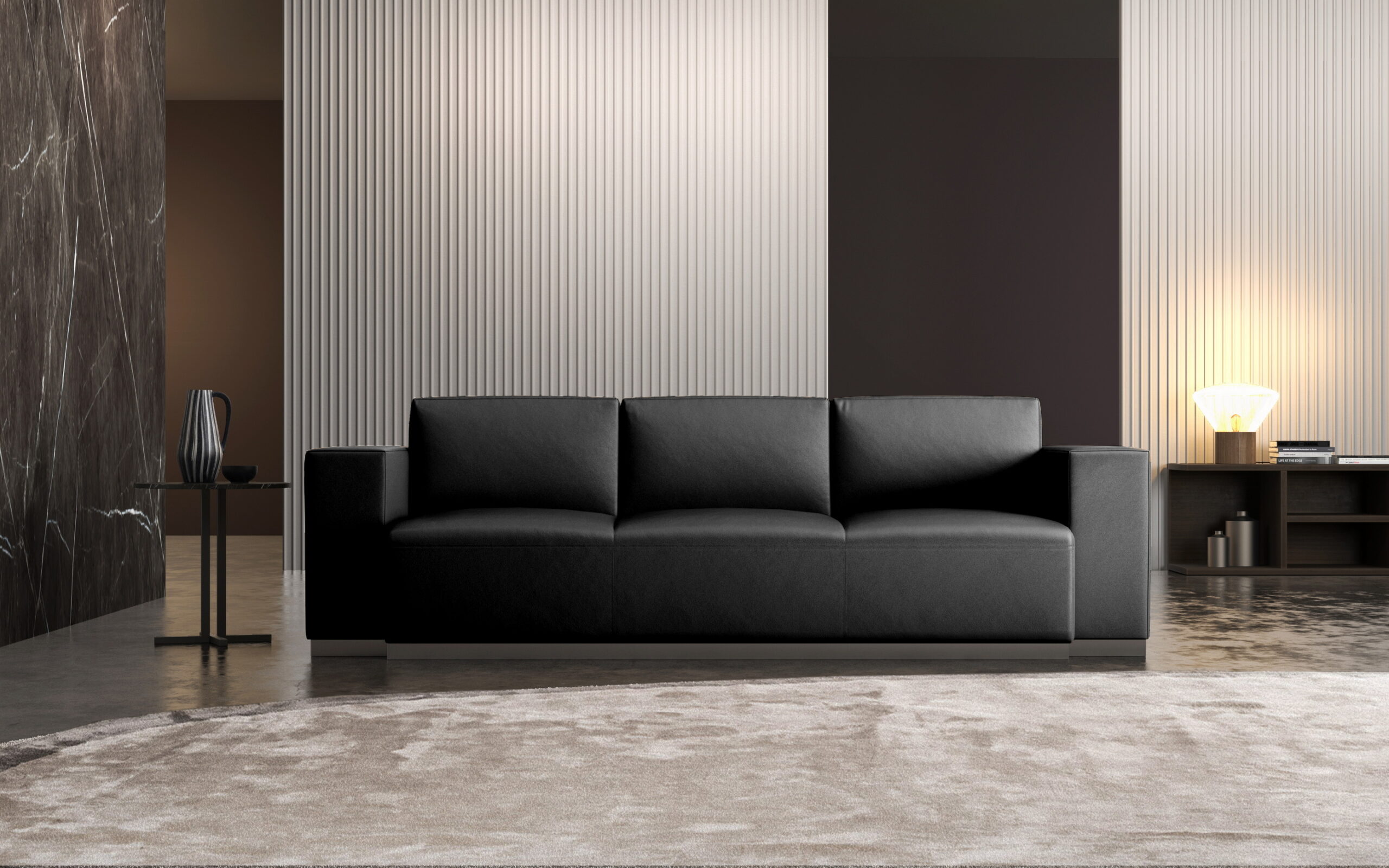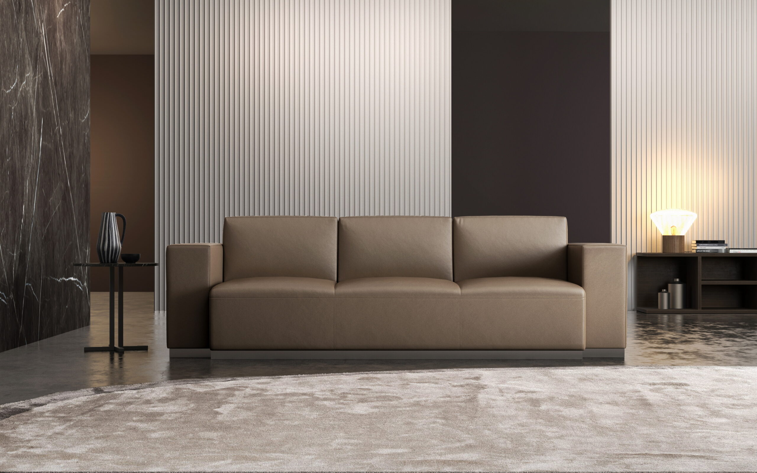 RANDAL 系列以大面積量體語言與俐落線條打造安定沉穩的接待空間。外型採用低視覺重心與寬敞扶手設計,使沙發在空間中呈現不張揚卻極具存在感的風格。
